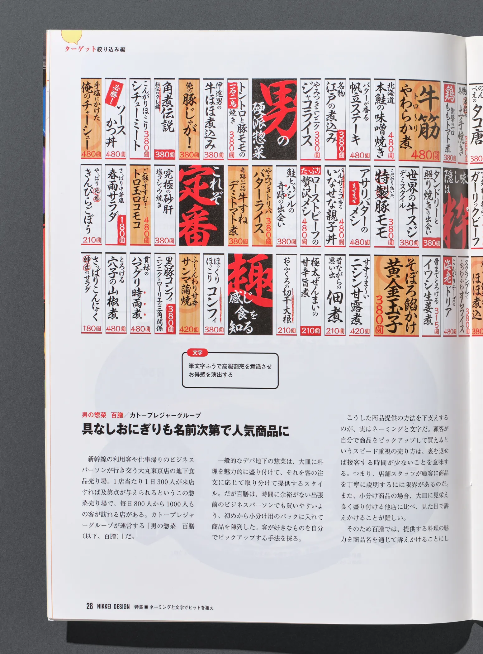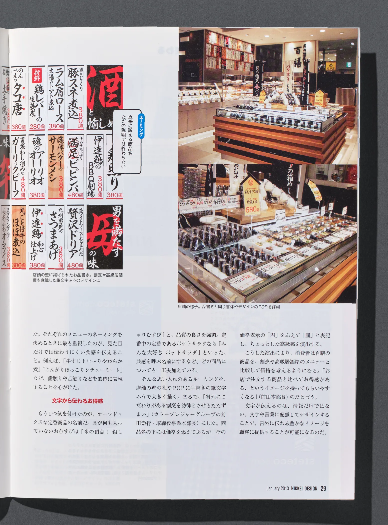 日経BP社が発行する「日経デザイン / ネーミングと文字でヒットを狙え」(2012年 12月24日発行)にて、当社代表の高井が手がけた、カトープレジャーグループ様が運営する「男の惣菜 百膳」のメニューのネーミングおよびデザインが特集されました。
