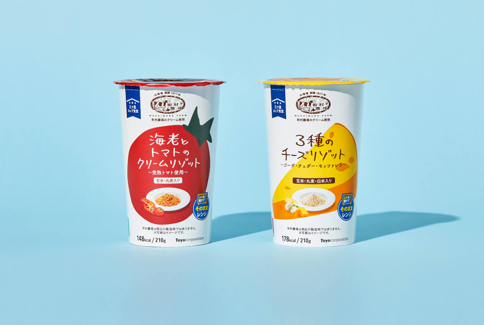 トーヨーコーポレーション様よりご依頼をいただき、当社でデザインを手がけた三ツ星カップ食堂「「町村農場 3種のチーズリゾット」と「町村農場 海老とトマトのクリームリゾット」」が発売されました。