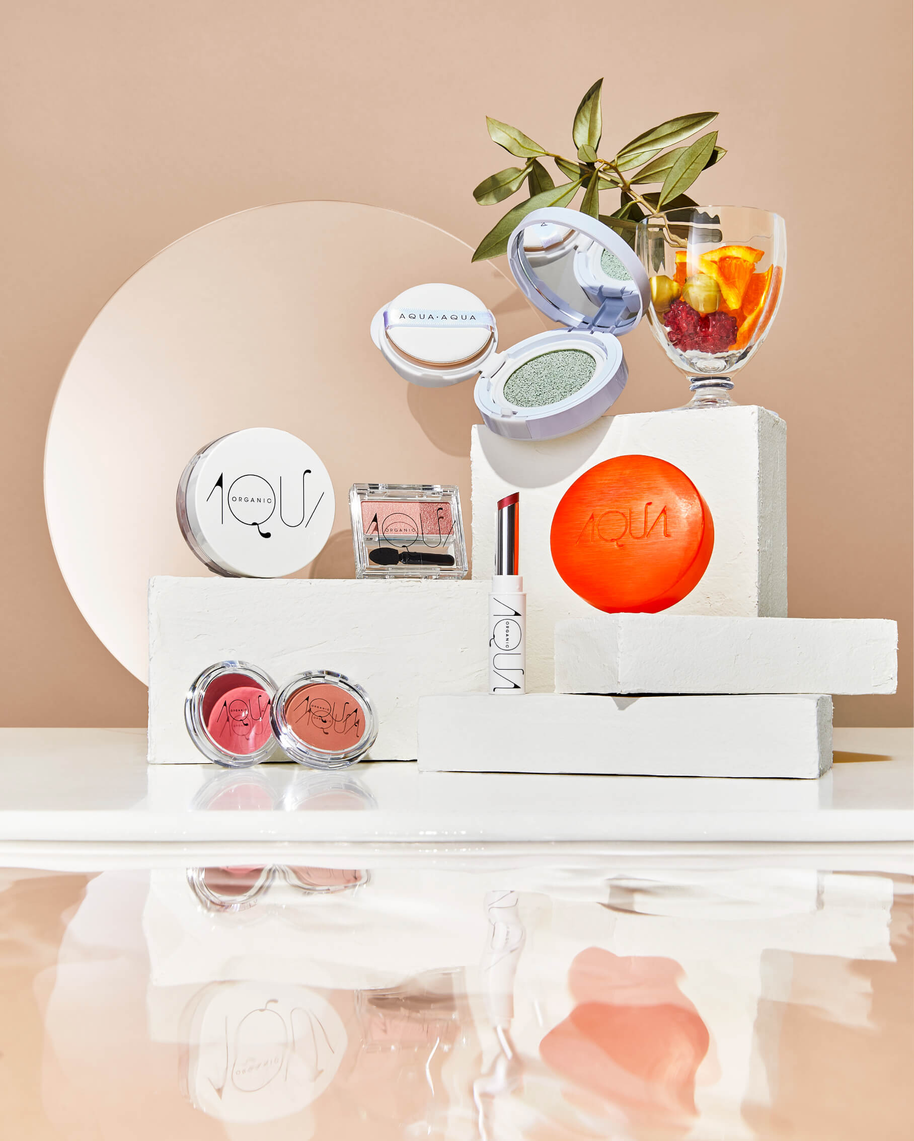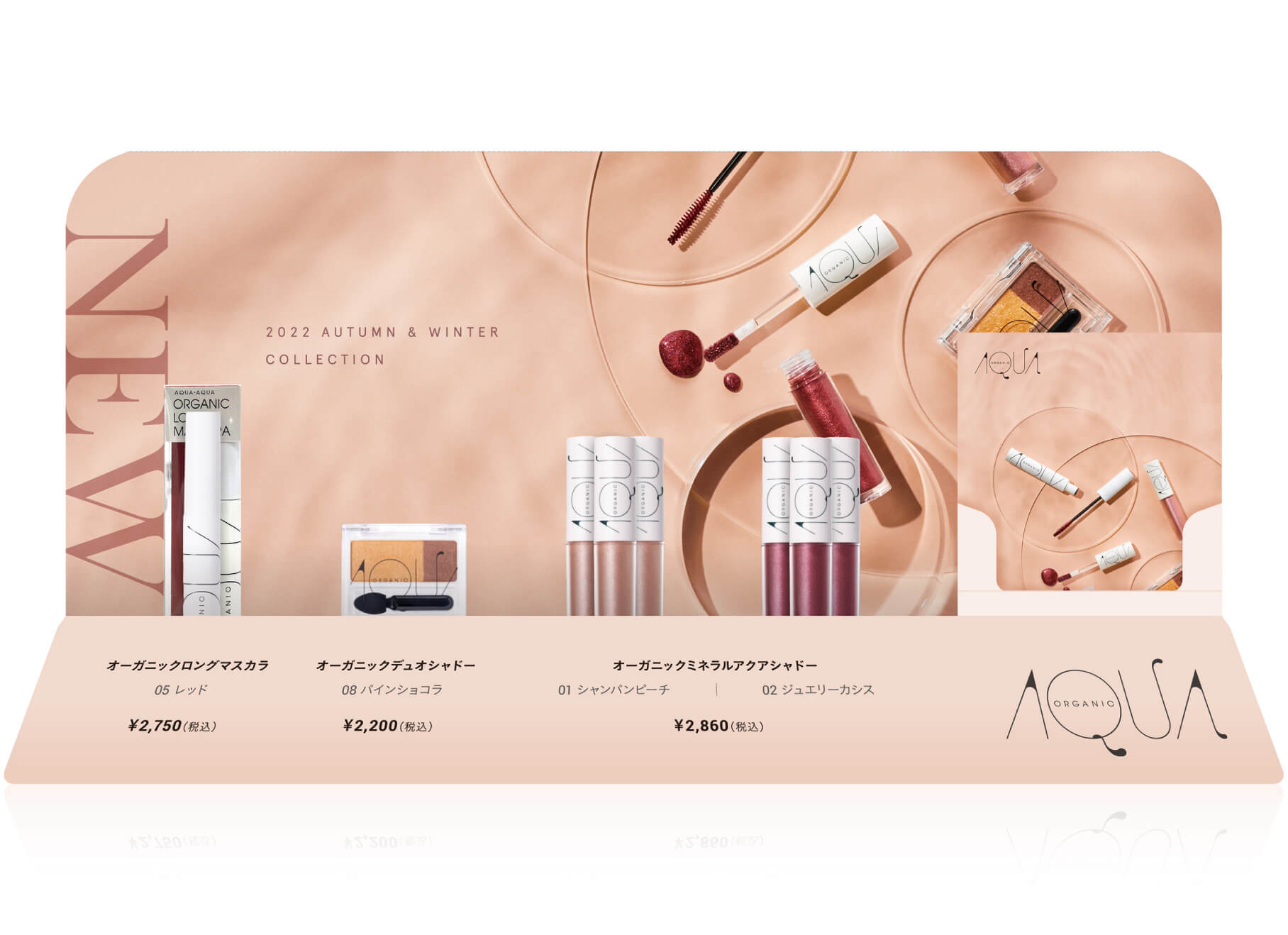 アクア・アクアの場合、植物オイルのフルーツエキスやミネラルなどの天然由来成分を豊富に配合した、本格ナチュラル処方のオーガニックコスメであるということから、トレンドを意識しながらも、飾りすぎず、ナチュラルでヘルシーなイメージに。また、ブランド名にも「アクア」と冠しているように、シーズンごとに“みずみずしさ”をキーワードにしたビジュアルづくりを行っています。