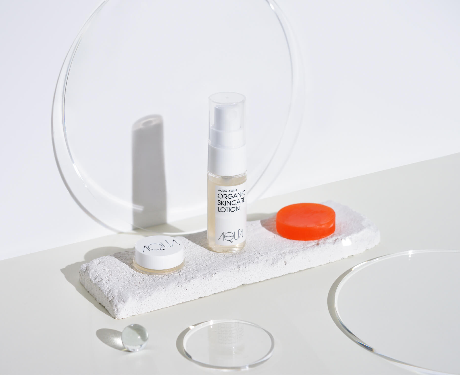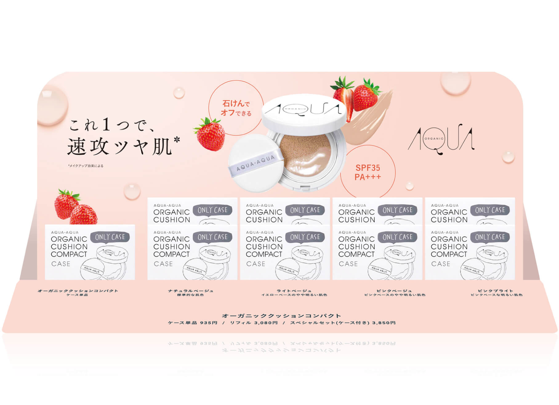 “フレッシュフルーツ美容液でみずみずしい肌へ導く”をコンセプトに、天然由来成分の商品を展開する国産オーガニックコスメブランド「AQUA・AQUA – アクア・アクア」のキービジュアル、プロモーション什器、リーフレットを制作しました。