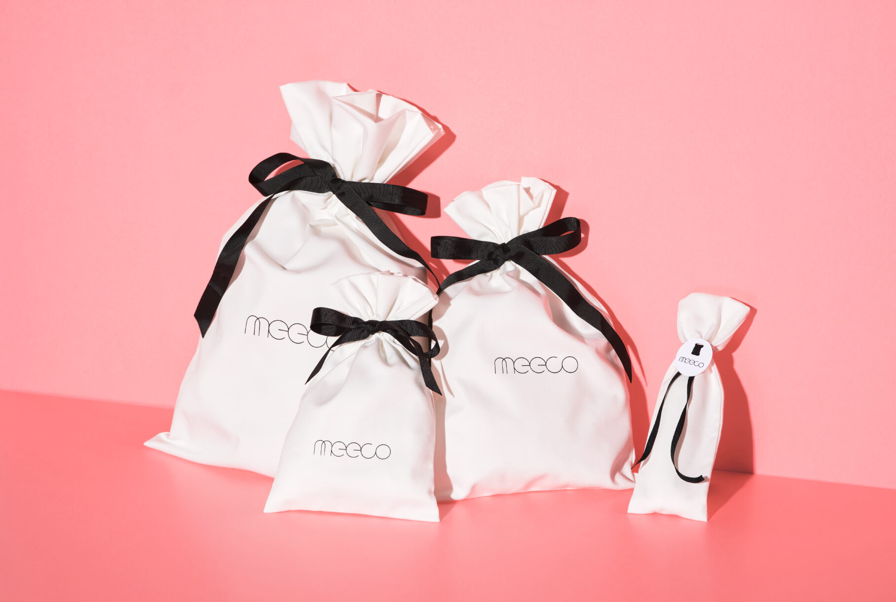 「meeco」にて、ギフト包装を希望されるお客様向けのギフトパッケージを制作しました。meecoでは幅広いブランドや商品を取り扱っているため、リップのような小さなアイテムからシャンプーボトルのような大きめの商品まで、多様なサイズに対応する必要があります。そのため、クライアントと何度も細かく打ち合わせを重ね、最終的に4種類のサイズで展開することに。生地感やリボンの質感、留め具など、細部までこだわりを込めて制作しました。