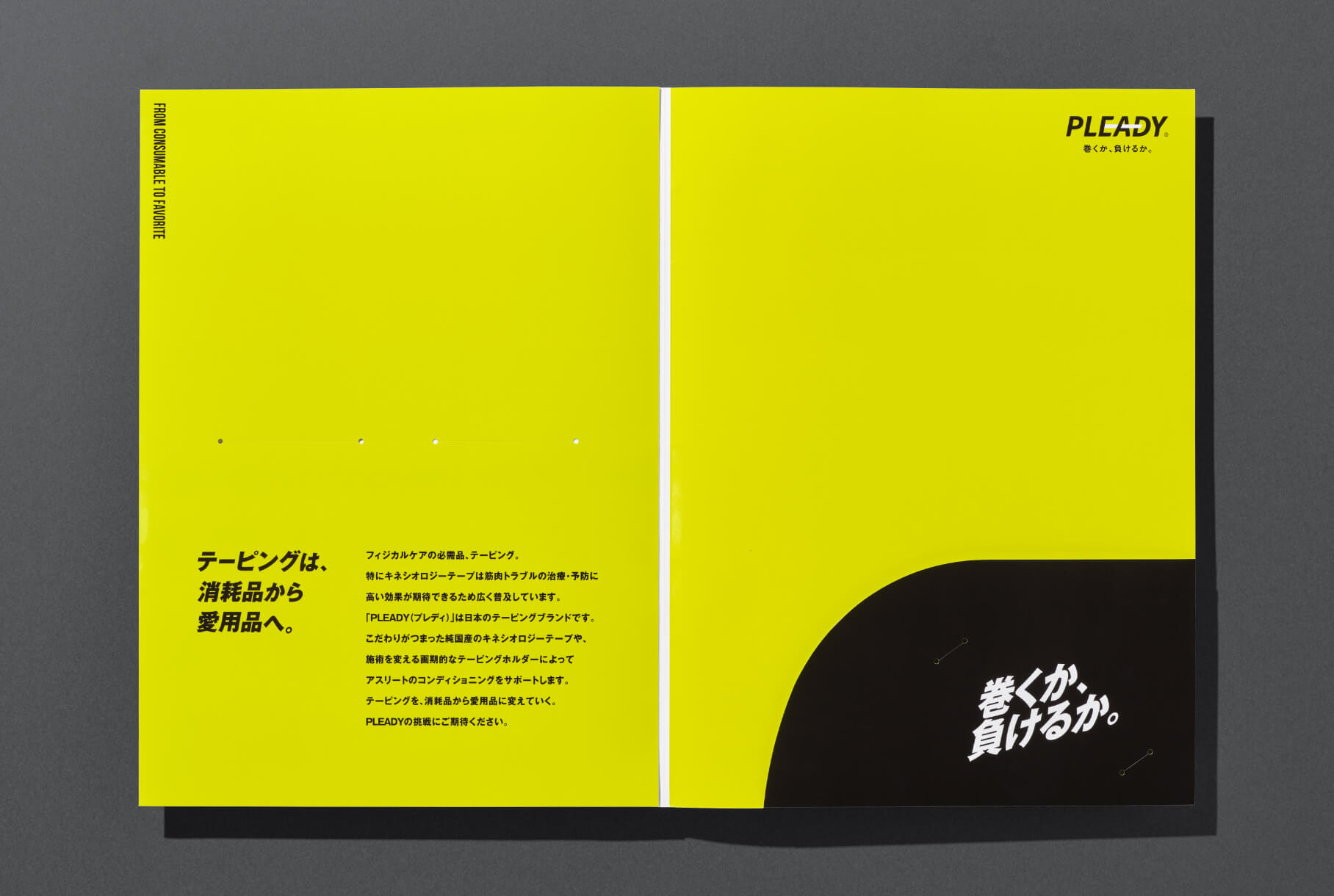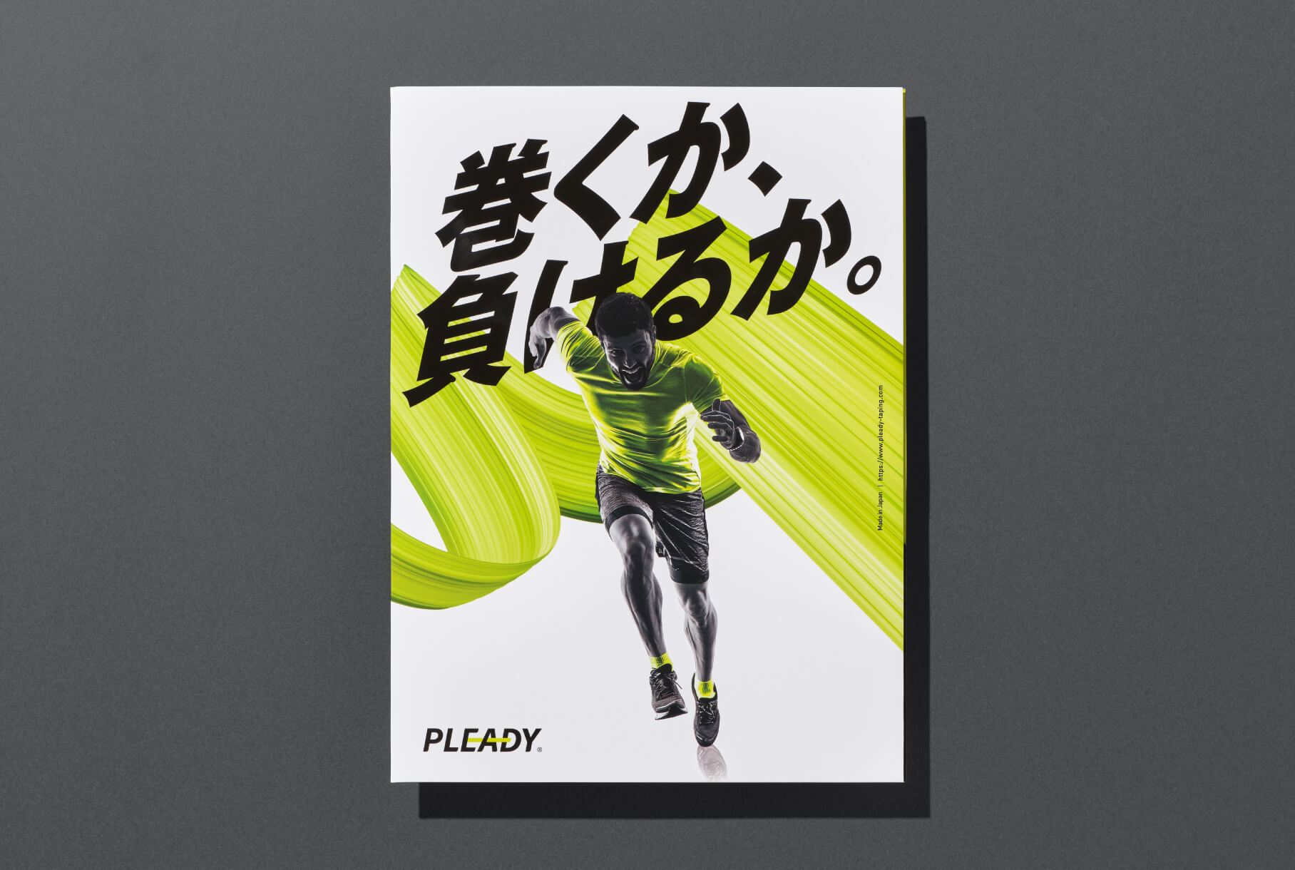 テーピングの試供品などを入れるタトウケースは、メインビジュアルの力強い世界観と「PLEADY」のイメージカラーであるライトグリーンを組み合わせた、ブランドの印象が記憶に強く残るような構成で制作しました。「巻くか、負けるか。」という魅力的なコピーがさらに引き立つようなデザインで、タトウケースを手にした人の心を掴むビジュアルに仕上げました。