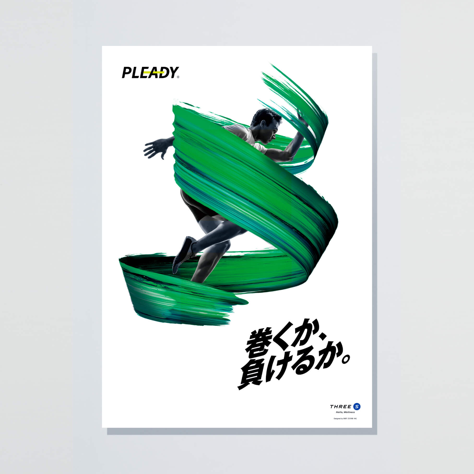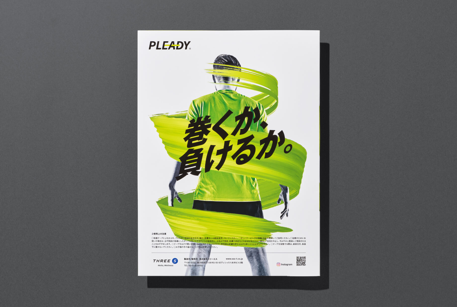 テーピングブランド「PLEADY – プレディ」の新商品「巻くか、負けるか。テープ」のパッケージデザインとタトウケース、メインビジュアル作成を、“生活者の健康増進と、アスリートの挑戦を支える。”というテーマのもとテーピング、ウェルネスサービス事業を展開するTHREE S(スリーエス)様からのご依頼で制作しました。「PLEADY」のキネオロジーテープ(テーピング)は日本製の生地のみを使用し、実績豊富な国内工場において職人の手で一つひとつ丁寧に作られる国内製造(MADE IN JAPAN)で、安全性・品質はトップレベルの製品です。そのためパッケージデザインには上質感だけではなくブランド面においても、他社製品とは決定的な差別化が求められました。