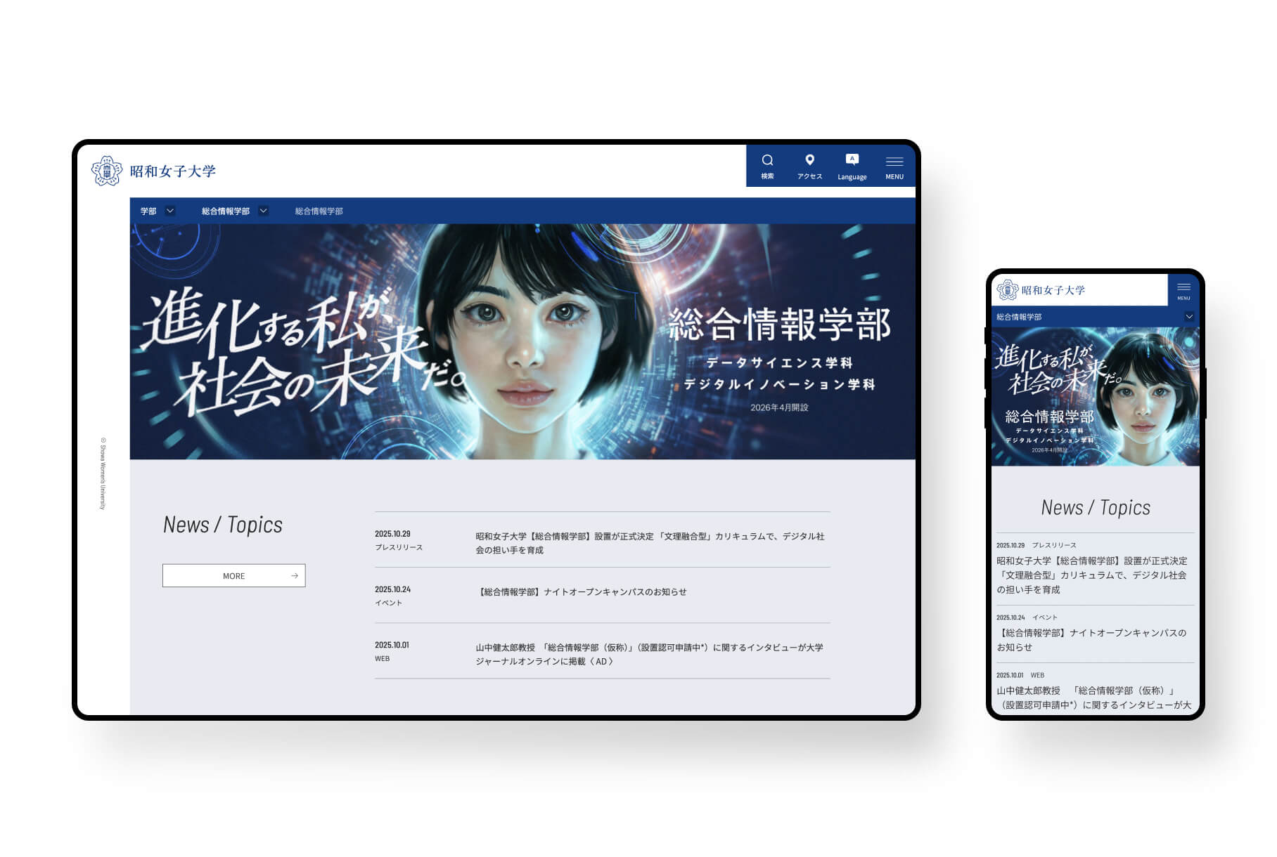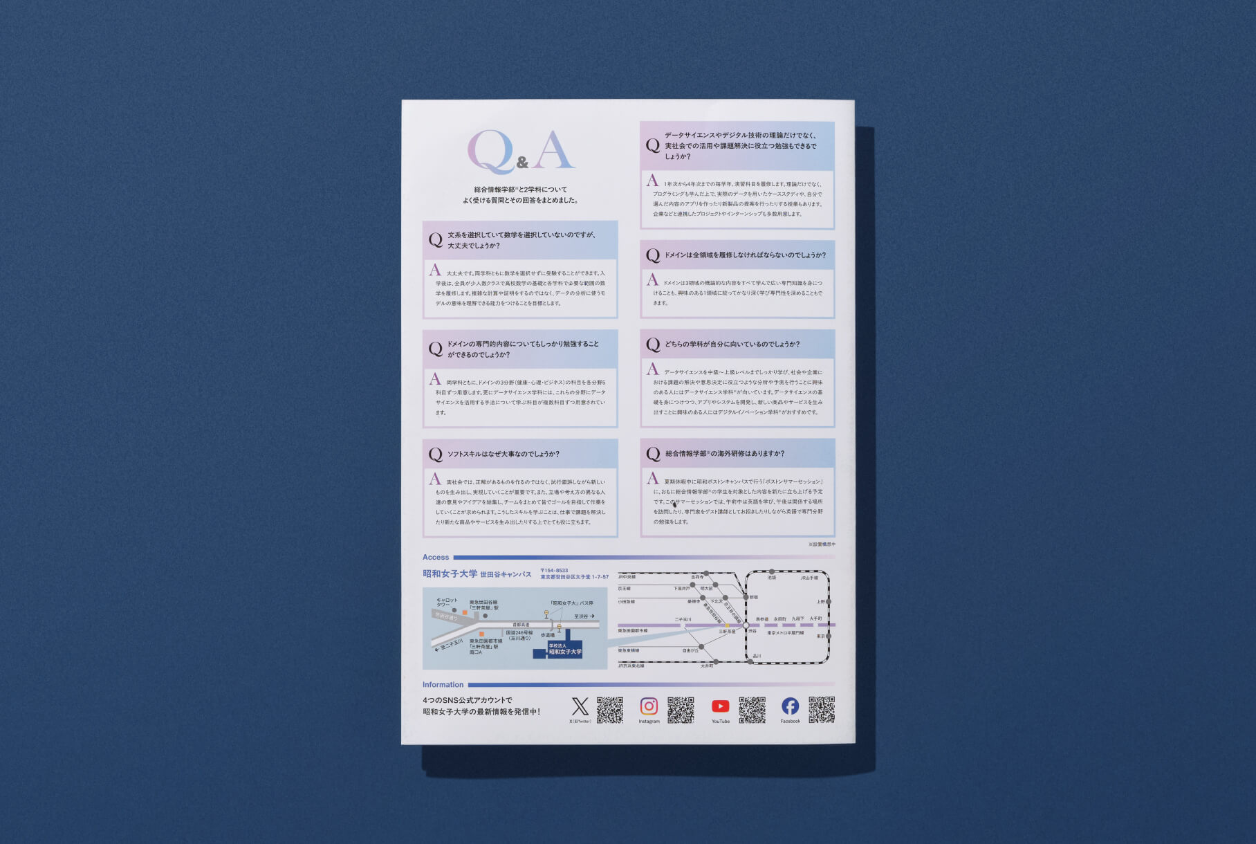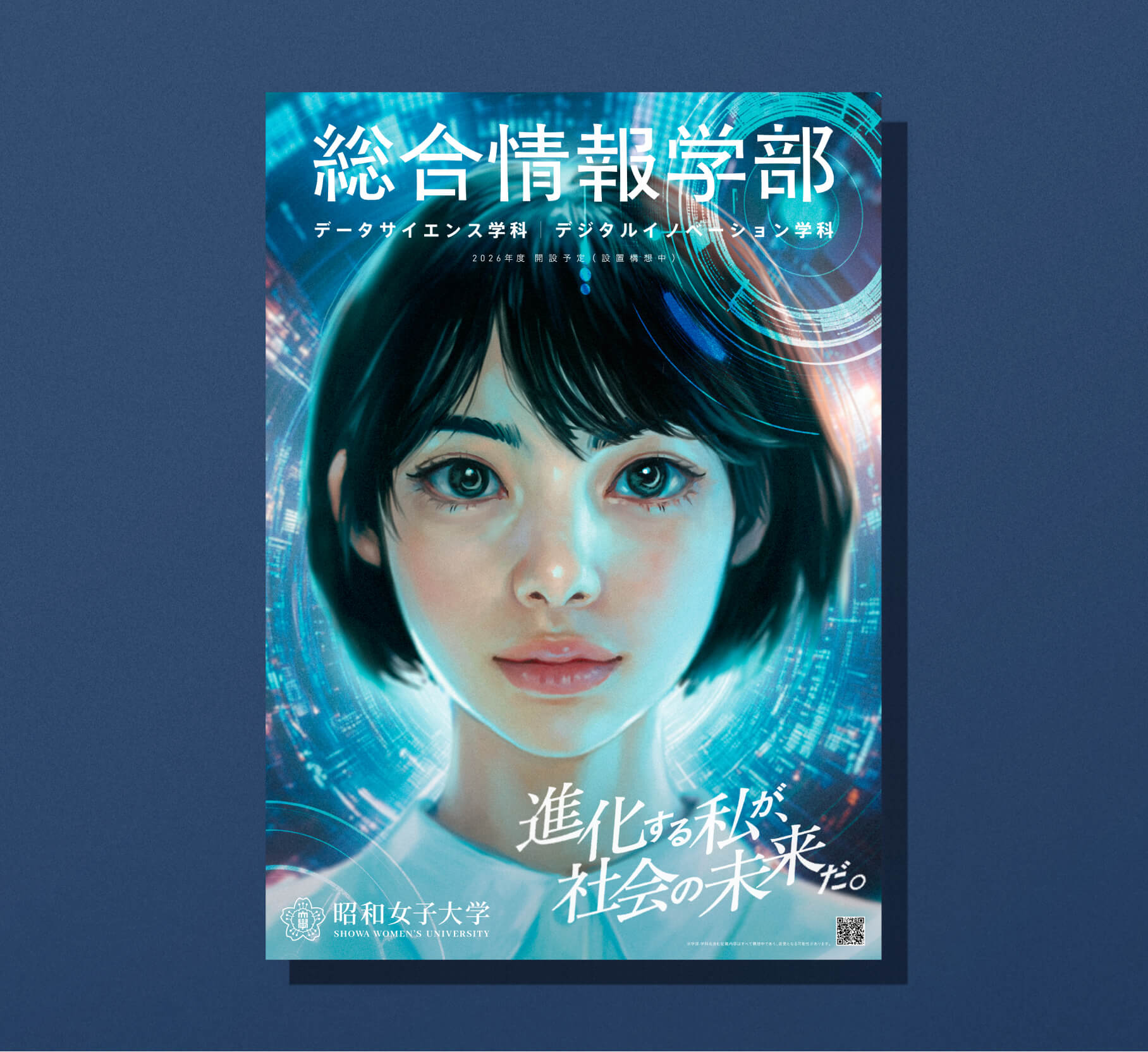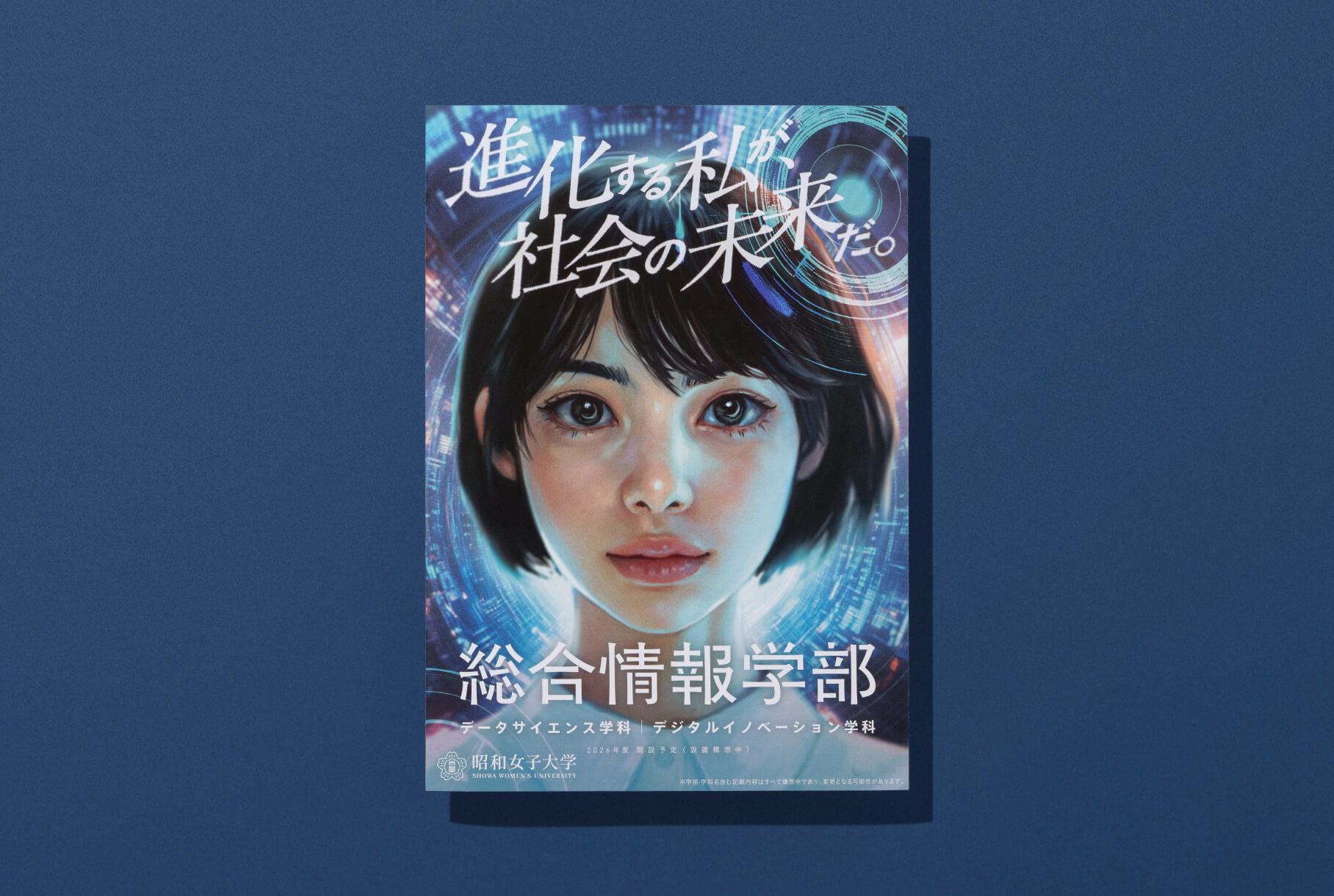 世田谷区にある昭和女子大学様からのご依頼で、2026年4月に新設される総合情報学部のイメージビジュアル・ポスター・パンフレットを制作しました。総合情報学部は時代の変化に対応するために新設される学部であることから、ただ情報を伝えるだけではなく、未来を感じさせる先進性と学びの場としての安心感の双方を届けることを目指しました。