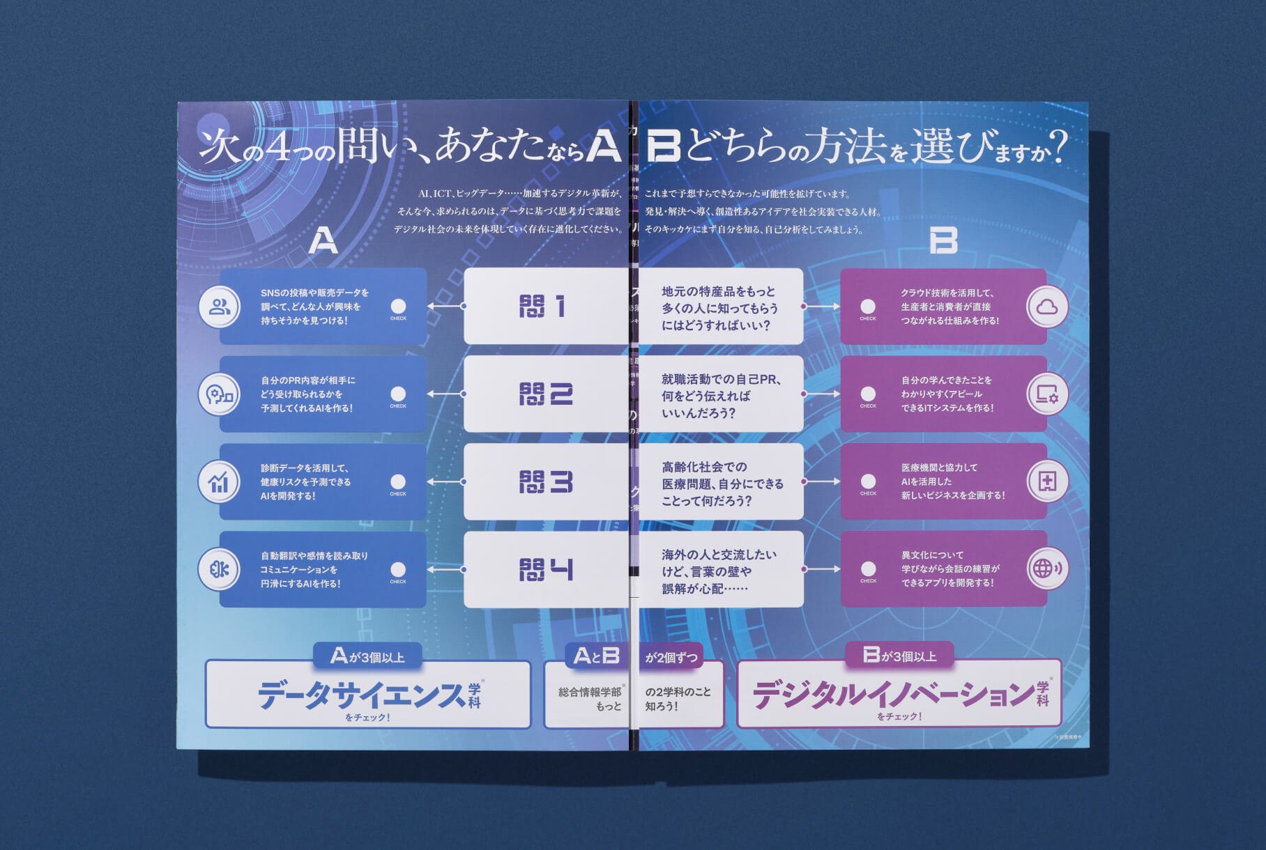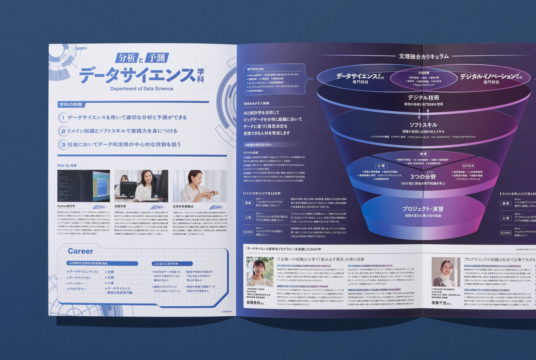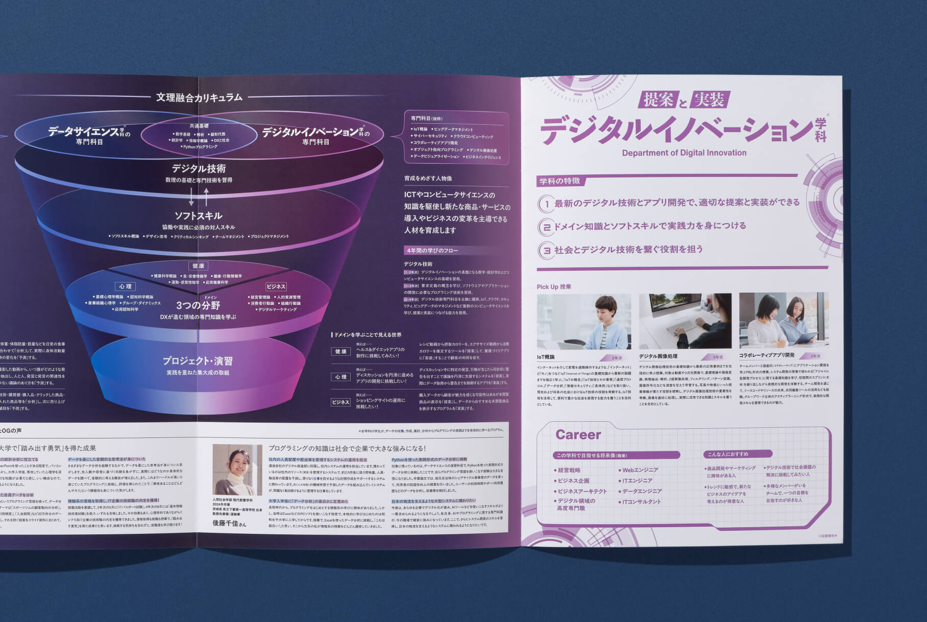 パンフレットの構成においては、「データサイエンス学科」と「デジタルイノベーション学科」という2学科の特色を一目で比較しやすいよう、両観音開きを採用。ブルーとパープルを基調とした配色は、それぞれの学科の専門性を象徴させるとともに、全体として「デジタル」や「近未来」を想起させる世界観にまとめています。中面では学びのプロセスをフローチャートで表現し、学生が入学後にいかなる学びを経て、どのようなキャリアへとつながっていくのかを直感的に理解できる設計としました。